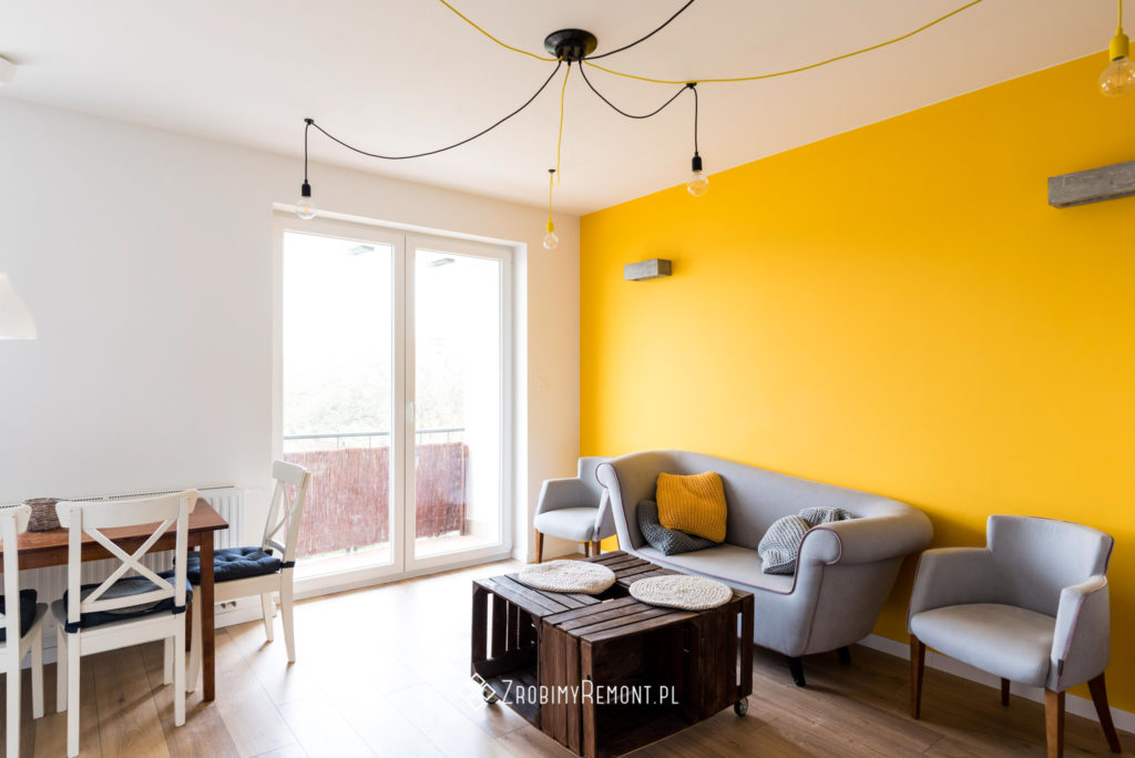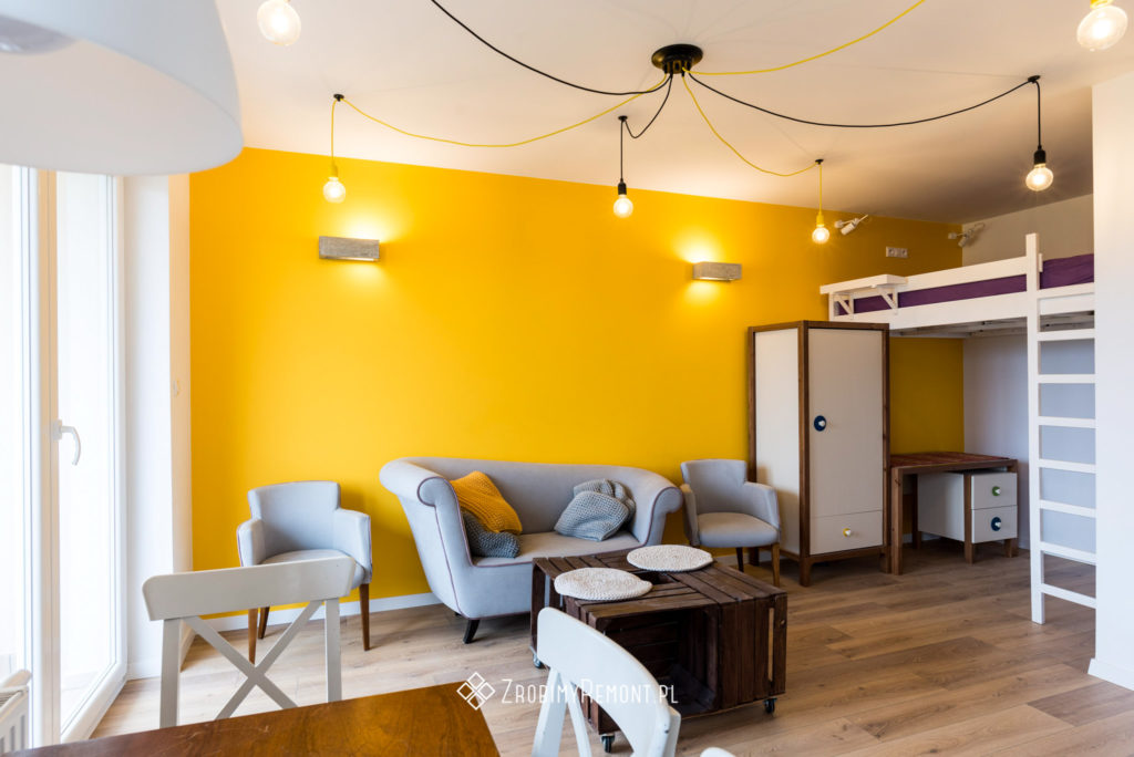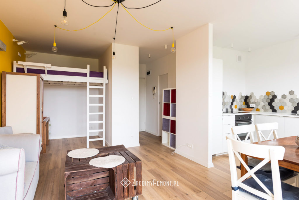 Przyjemna i wszechstronna kawalerka. Dzięki antresoli uzyskaliśmy więcej miejsca do codziennego funkcjonowania.